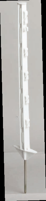 Weißer, stabiler, vollisolierter Kunststoffpfahl mit Eisenspitze u. doppelter Trittstufe. Gesamtlänge 73 cm, Zaunhöhe ca. 55 cm.