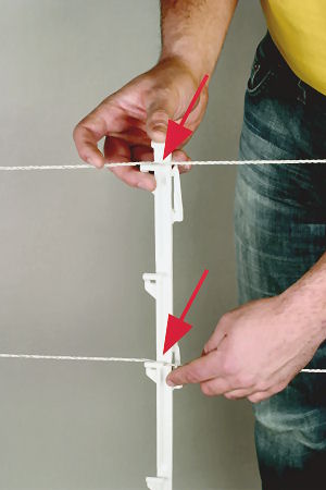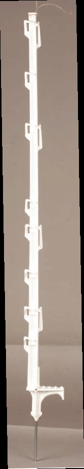 Stabiler Kunststoffpfahl mit speziellen Drahthalterungen für schnelle und schonende Drahtbefestigung. 8 Halterungen für Litze und Band bis 12,5 mm, bzw. 4 Halterungen für Band bis 40 mm. 105 cm lang. Zaunhöhe ca. 85 cm. Weiß.