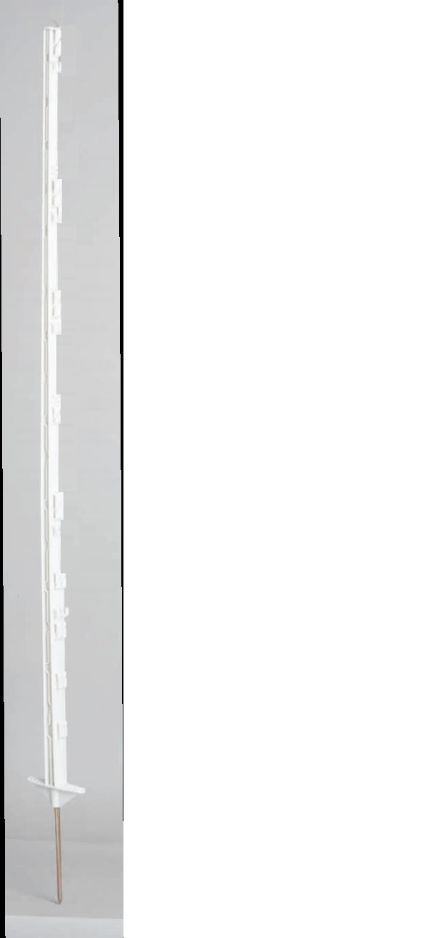 Weißer, stabiler, vollisolierter Kunststoffpfahl mit Eisenspitze u. doppelter Trittstufe. Gesamtlänge 155 cm, Zaunhöhe ca. 130 cm.