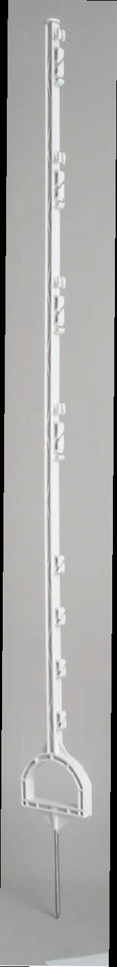 Weißer, glasfaserverstärkter, vollisolierender Kunststoffpfahl. Metallspitze. Robuster Steigbügelfußtritt für leichtes Eintreten.