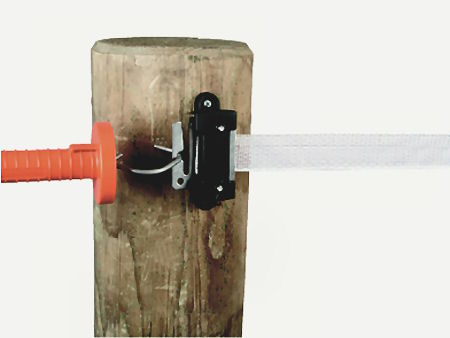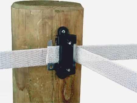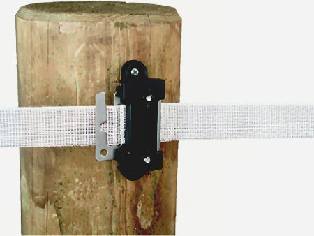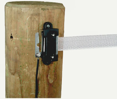 Massiver Isolator mit Edelstahl-Verbindungsplatte für Breitbänder bis 40 mm. Vielfältige Verwendungsmöglichkeiten in 40 mm Breitbandzäunen. Z.B. als Anfangsisolator, zur Bandverbindung, als 3-fach Isolator, als Torgriffisolator.