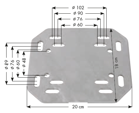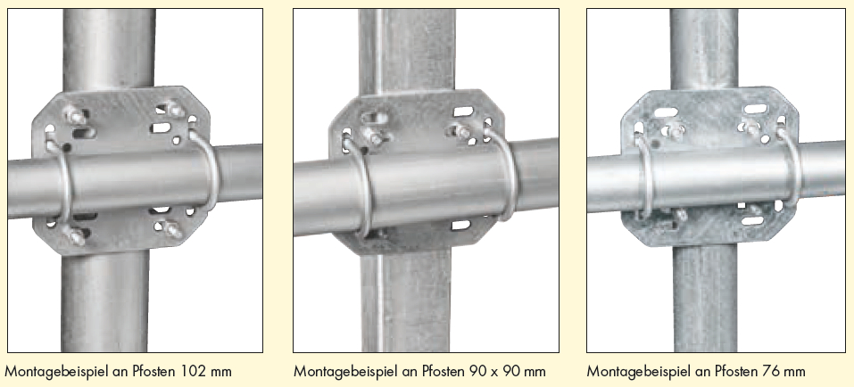 Für Pfosten-Rohr-Verbindungen. Ermöglicht das Verbinden von Pfosten 60 mm, 76 mm, 90x90 mm, 102 mm mit Rohren 48,3 mm, 60 mm, 76 mm, 89 mm.