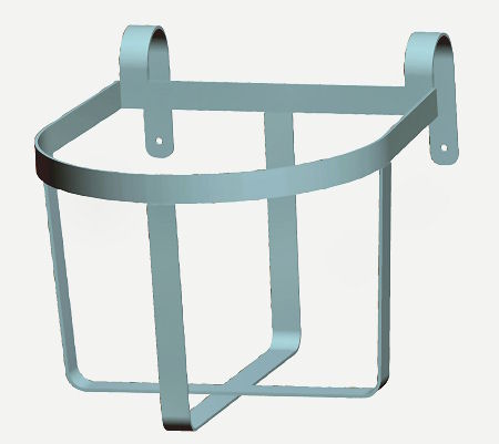 Breite 33 cm, Höhe 23 cm, Tiefe 33 cm. Verzinkter Flachstahl. Lasche zum Einhängen in Rohre und Bretterwände bis 55 mm. Für Eimer mit 28 cm Drm.