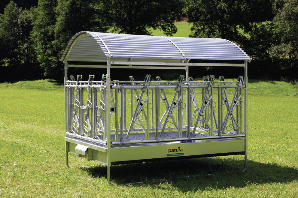 Profi-Viereckraufe mit Sicherheits-Fangfressgitter, Dach und Trog