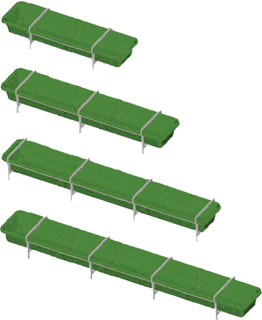 • 1,5 m lange Endstücke, sowie 1 oder 2 m lange Verlängerungen werden zu 3, 4, 5, 6 Meter langen Trögen zusammengesetzt