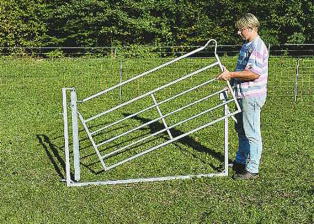 Das Schwingschiebetor wird hauptsächlich zum Eintreiben der Schafe aus dem Fangraum in den Treibgang benutzt. Es kann komplett durch die drehbare Aufhängung gezogen werden. So muss man das Tor nicht gegen die nachrückenden Herde zurück drücken, sondern kann es durch die Aufhängung nach hinten in den Fangraum ziehen und den nächsten Trupp Schafe in den Treibgang schieben.